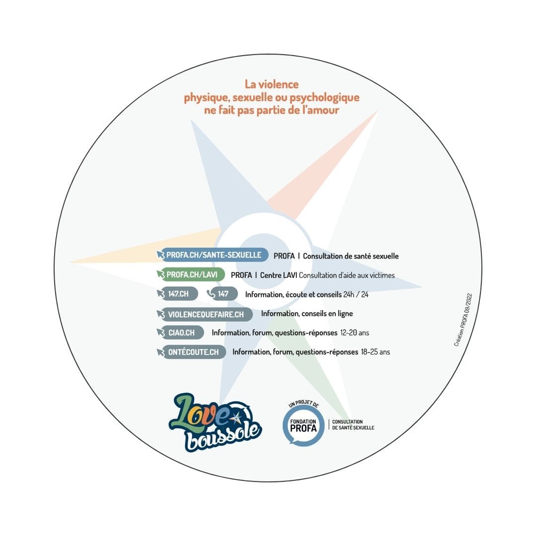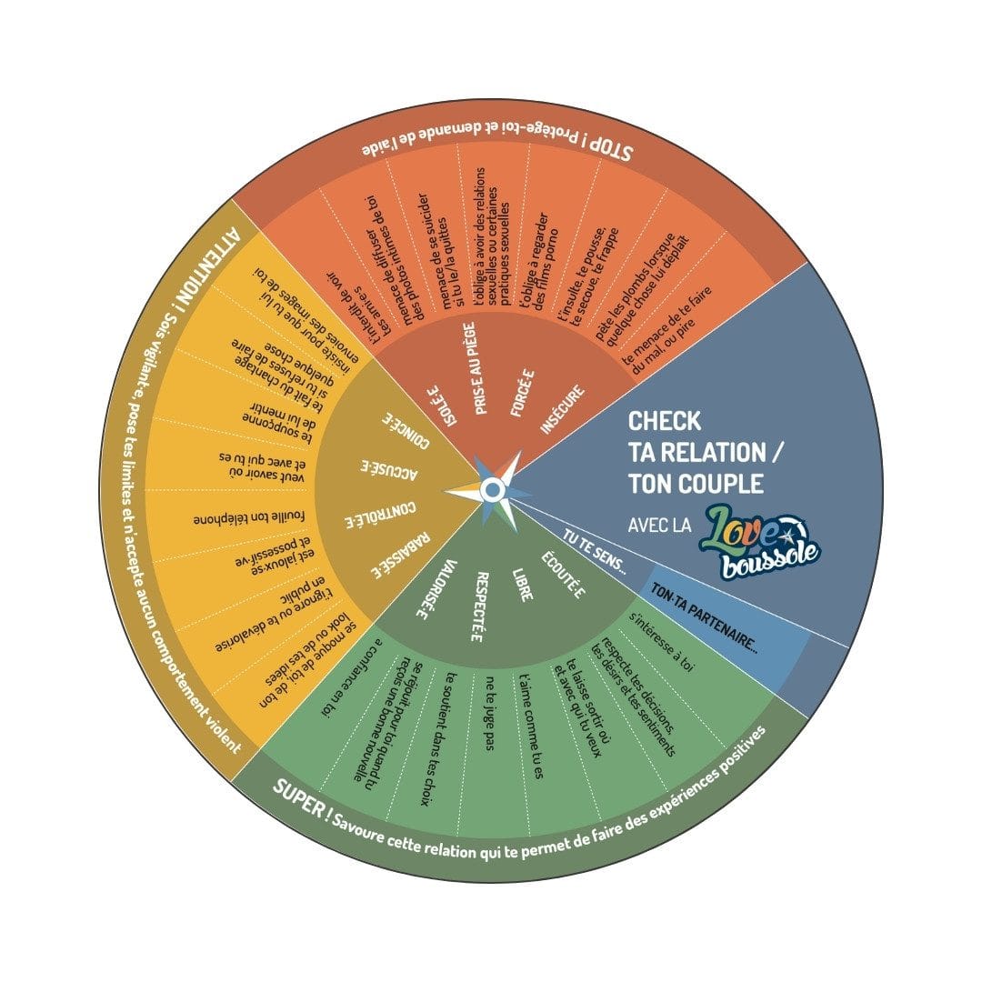 J'imagine et je conçois la Love boussole. Cet outil, dont le nom évocateur combine l'univers amoureux et l'idée de repères directionnels, prend la forme d'un disque cartonné. Il décrit 24 faits et gestes répartis en trois catégories distinctes, selon un code couleur intuitif inspiré des feux de signalisation.