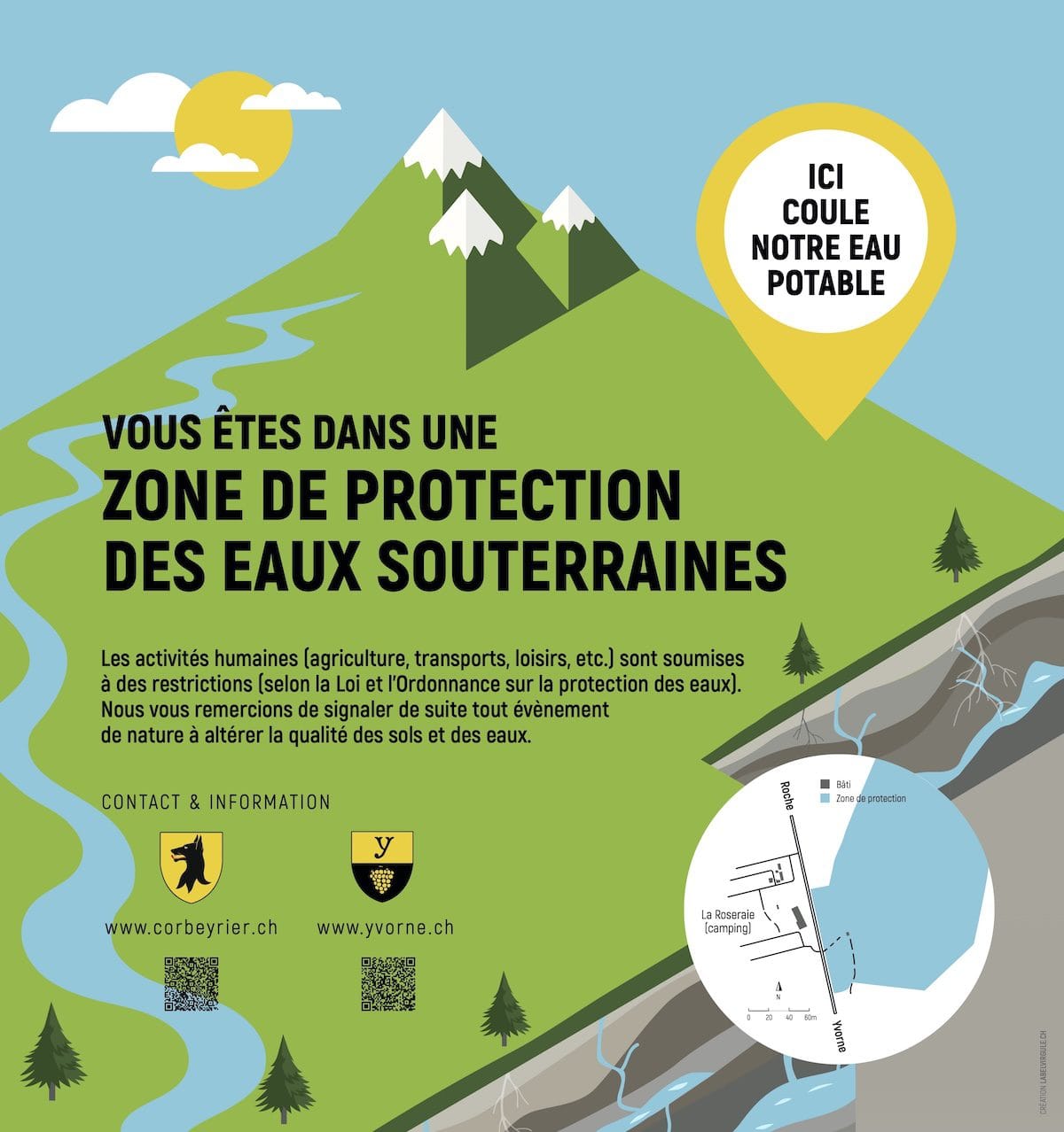 Les communes d'Yvorne et de Corbeyrier font appel à mes services pour créer une signalétique destinée à sensibiliser le public aux zones de protection des eaux souterraines sur leur territoire. Face aux enjeux croissants de préservation de la qualité de l'eau potable, ces collectivités souhaitent informer la population, les hôtes de passage et les professionnel-les des restrictions d'usage dans ces périmètres sensibles.